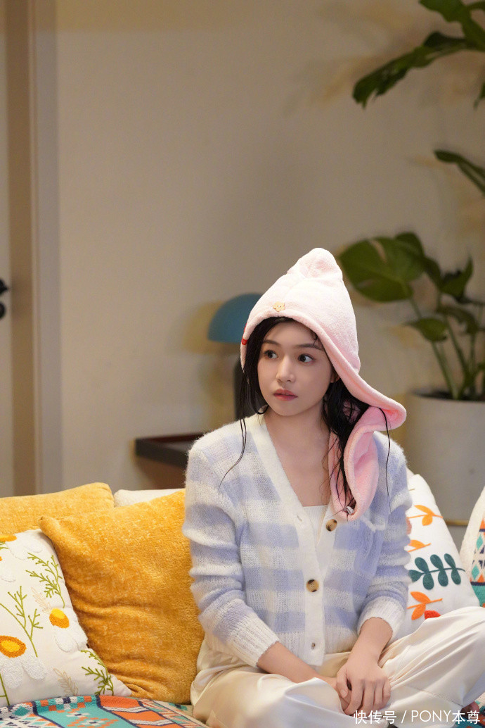 在色彩搭配上,也很有少女韵味!她身穿一件紫白色条纹开衫,内搭一件白色吊带衫,下半身搭配米白色直筒裤,头戴粉色浴帽!